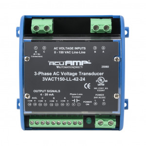 Precio no incluye IVAAcuAMP AC voltage transducer, 3-phase, 0-150 VAC line-to-line sensing range, True RMS, (4) 4-20 mA and (1) relay, SPST-N.O. output, 0.5A @ 125 VAC, 1A @ 30 VDC output rating, phase loss @ 90 VAC non-adjustable trip point, 24 VAC/VDC operating voltage.