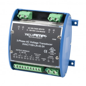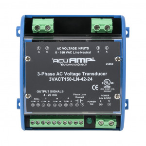 Precio no incluye IVAAcuAMP AC voltage transducer, 3-phase, 0-150 VAC line-to-neutral sensing range, True RMS, (4) 4-20 mA and (1) relay, SPST-N.O. output, 0.5A @ 125 VAC, 1A @ 30 VDC output rating, phase loss @ 90 VAC non-adjustable trip point, 24 VAC/VDC operating voltage.