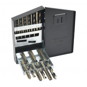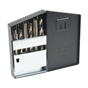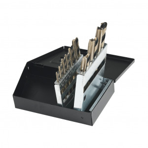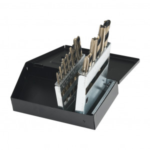 Set Includes | Includes (9) jobber-length drill bits (wire number size 36, wire number size 29, wire number size 25, wire number size 21, wire number size 7, letter size F, 5/16in, letter size U, 27/64in) (9) hand taps (#6-32 UNC, #8-32 UNC, #10-24 UNC, #10-32 UNF, 1/4-20 UNC, 5/16-18 UNC, 3/8-16 UNC, 7/16-14 UNC, 1/2-13 UNC), durable metal case |