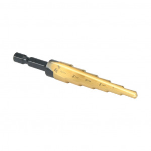 Precio no incluye IVAVIKING STEP DRILL BIT, 3/16IN TO 1/2IN, SIZE #4, 6 STEPS, SPLIT POINT, HIGH-SPEED STEEL (HSS), TITANIUM-NITRIDE (TIN) COATED FINISH, 1/4IN HEX SHANK, 2.5IN (64MM) OVERALL LENGTH.