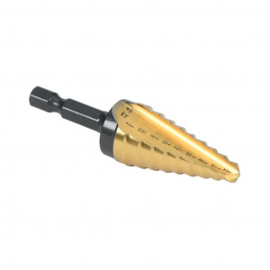 Precio no incluye IVAVIKING STEP DRILL BIT, 1/4IN TO 3/4IN, SIZE #3, 9 STEPS, SPLIT POINT, HIGH-SPEED STEEL (HSS), TITANIUM-NITRIDE (TIN) COATED FINISH, 1/4IN HEX SHANK, 2.5IN (64MM) OVERALL LENGTH.