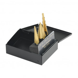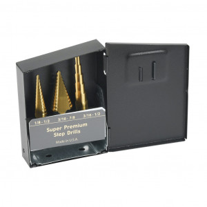 Set Includes | Includes (1) #1 13 step drill bit (1/8in, 5/32in, 3/16in, 7/32in, 1/4in, 9/32in, 5/16in, 11/32in, 3/8in, 13/32in, 7/16in, 15/32in, 1/2in), (1) #4 6 step drill bit (3/16in, 1/4in, 5/16in, 3/8in, 7/16in, 1/2in), (1) #8 12 step drill bit (3/16in, 1/4in, 5/16in, 3/8in, 7/16in, 1/2in, 9/16in, 5/8in, 11/16in, 3/4in, 13/16in, 7/8in), plastic carrying case |