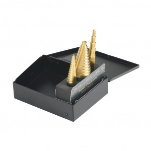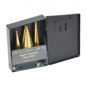 Set Includes | Includes (1) #1 13 step drill bit (1/8in, 5/32in, 3/16in, 7/32in, 1/4in, 9/32in, 5/16in, 11/32in, 3/8in, 13/32in, 7/16in, 15/32in, 1/2in), (1) #4 6 step drill bit (3/16in, 1/4in, 5/16in, 3/8in, 7/16in, 1/2in), (1) #2 8 step drill bit (1/4in, 5/16in, 3/8in, 7/16in, 1/2in, 9/16in, 5/8in, 11/16in, 3/4in, 13/16in, 7/8in, 1in), plastic carrying case |