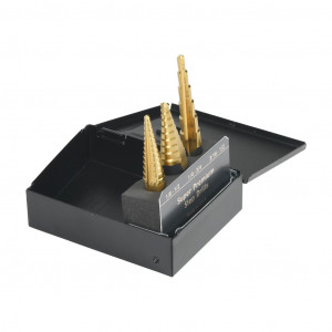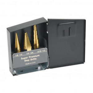 Set Includes | Includes (1) #1 13 step drill bit (1/8in, 5/32in, 3/16in, 7/32in, 1/4in, 9/32in, 5/16in, 11/32in, 3/8in, 13/32in, 7/16in, 15/32in, 1/2in), (1) #4 6 step drill bit (3/16in, 1/4in, 5/16in, 3/8in, 7/16in, 1/2in), (1) #3 9 step drill bit (1/4in, 5/16in, 3/8in, 7/16in, 1/2in, 9/16in, 5/8in, 11/16in, 3/4in), plastic case |