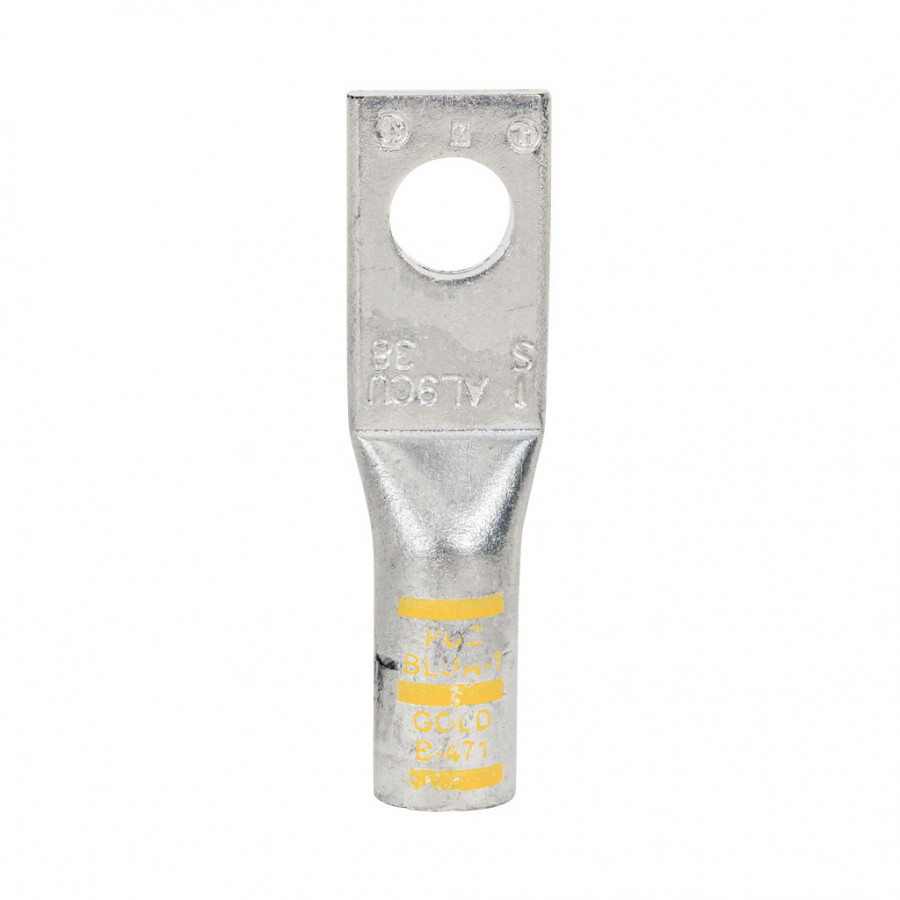 Precio no incluye IVAPenn-Union BLUA series compression lug, standard barrel, tin-plated aluminum, 35 kV, 3/8in mounting bolt, 1-hole, 1 AWG, gold markings, AL9CU.