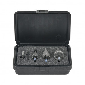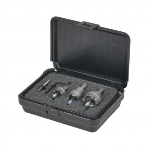 Set Includes | Includes (3) carbide tipped hole cutters (7/8in (22mm), 1-1/8in (29mm), 1-3/8in (35mm)), (1) TCT stepped pilot drill, (1) ejector spring, (1) hex key, (1) tool storage case |