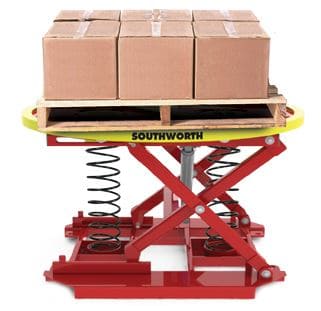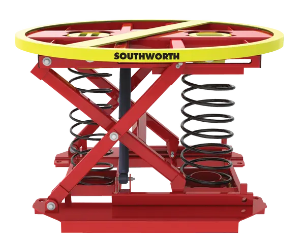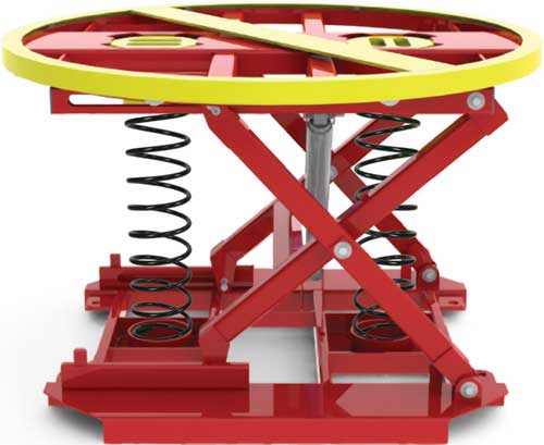 Precio no incluye IVAPALLETPAL 360 - SPRING LEVEL LOADER.CAPACITY SPRING RANGE #4 - INCLUDES ONE ORANGE SPRING, ONE GRAY SPRING AND ONE PURPLE SPRING. THIS SPRING RANGE IS DESIGNED FOR PALLETS WEIGHING UP TO 4500 LBS.TURNTABLE RING LOW FRICTION, BEARING-SUPPORTED TURNTABLE, 43-5/8" DIAMETER (APPROX).BASE FRAME 36" X 36'' (INCLUDES FORK POCKETS)FORK POCKETS LOCATED ON SIDES OF BASE FRAME.COMPRESSED HEIGHT 9-1/2"EXTENDED HEIGHT 27-3/4"FINISH RED MACHINERY ENAMEL WITH TURNTABLE RING AND FORK POCKETS PAINTED OSHA SAFETYYELLOW. TURNTABLE RING IS POWDER COATED.WARRANTY LIFETIME WARRANTY ON SPRINGS.