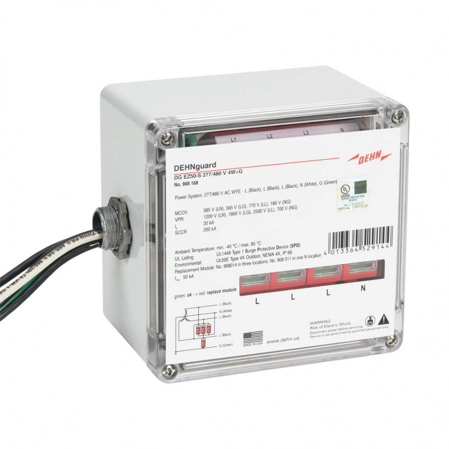 Dehn EZ50-S series power Surge Protective Device (SPD), 20 kA discharge current, 480/277 VAC 3-Phase Wye, neutral ground protection, parallel circuit, NEMA 4X enclosure rating, IP66, 1/2in NPSM/Wall mount.