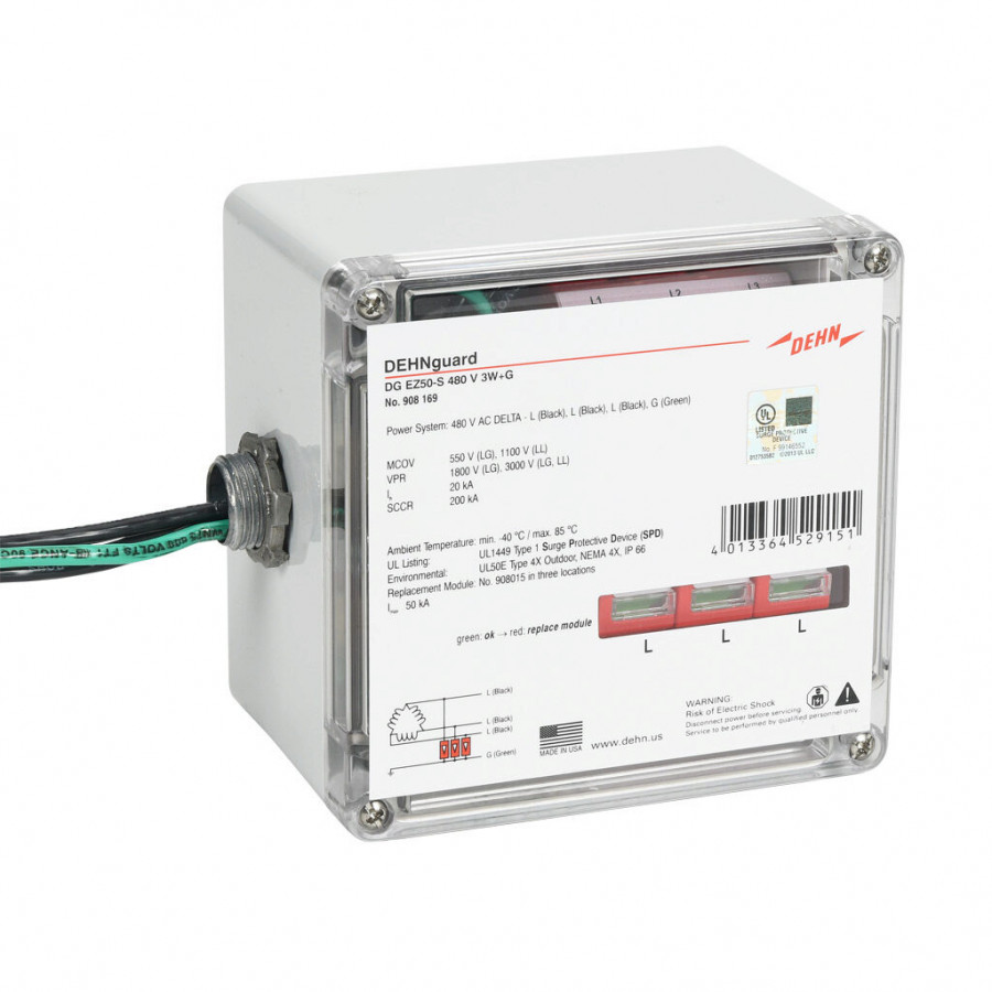 Precio no incluye IVADehn EZ50-S series power Surge Protective Device (SPD), 20 kA discharge current, 480 VAC 3-Phase Delta, parallel circuit, NEMA 4X enclosure rating, IP66, 1/2in NPSM/Wall mount.