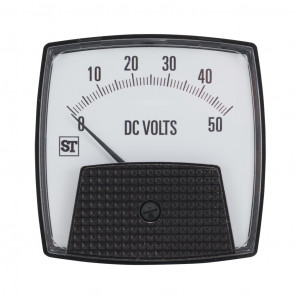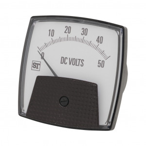 SIFAM TINSLEY SMARTLOOK PANEL METER, 3.5IN ANALOG DIAL DISPLAY, 0-50 VDC, VOLTAGE INPUT, SELF CONTAINED, MOVING COIL, ROUND 3-HOLE MOUNT.