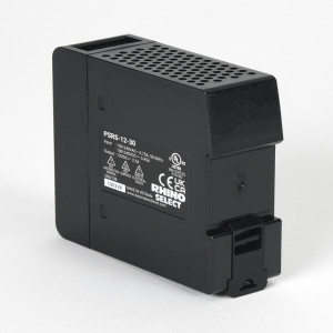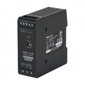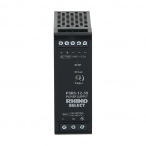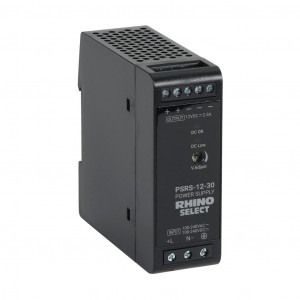 RHINO SELECT PSRS SERIES SWITCHING POWER SUPPLY, 12 VDC @ 2.5A/30W (ADJUSTABLE), 120/240 VAC NOMINAL INPUT, 1-PHASE, ENCLOSED, PLASTIC HOUSING, 35MM DIN RAIL MOUNT, SCREW TERMINALS.