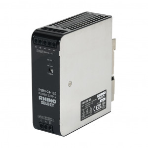 RHINO SELECT PSRS SERIES SWITCHING POWER SUPPLY, 24 VDC @ 5A/120W (ADJUSTABLE), 120/240 VAC NOMINAL INPUT, 1-PHASE, ENCLOSED, METAL HOUSING, 35MM DIN RAIL MOUNT, SCREW TERMINALS.